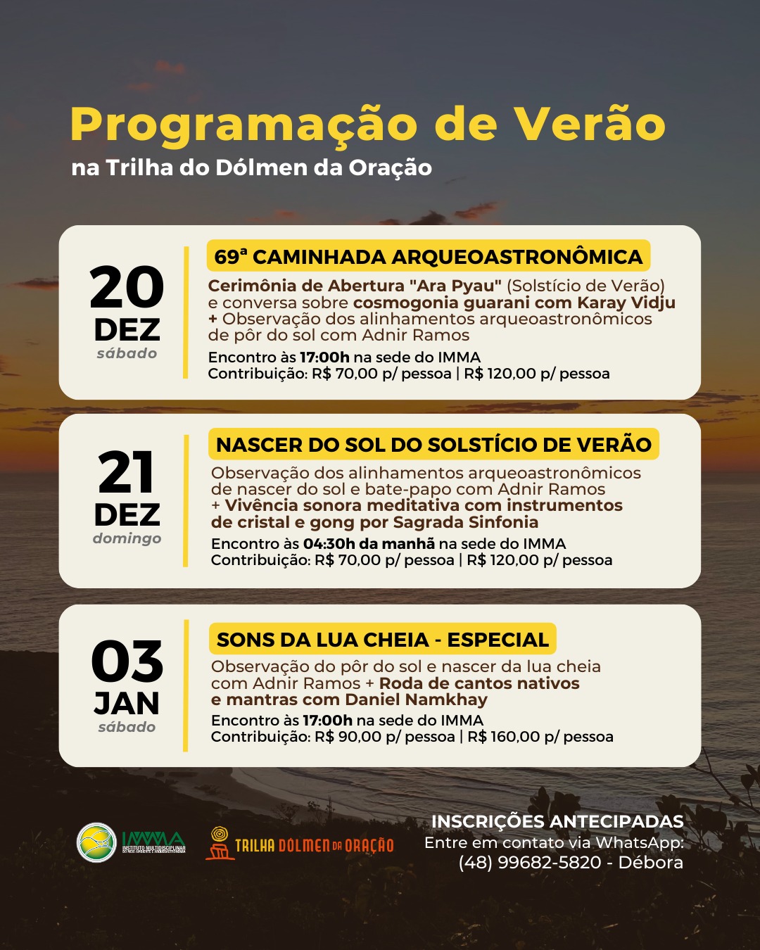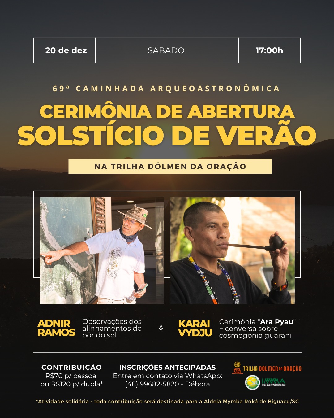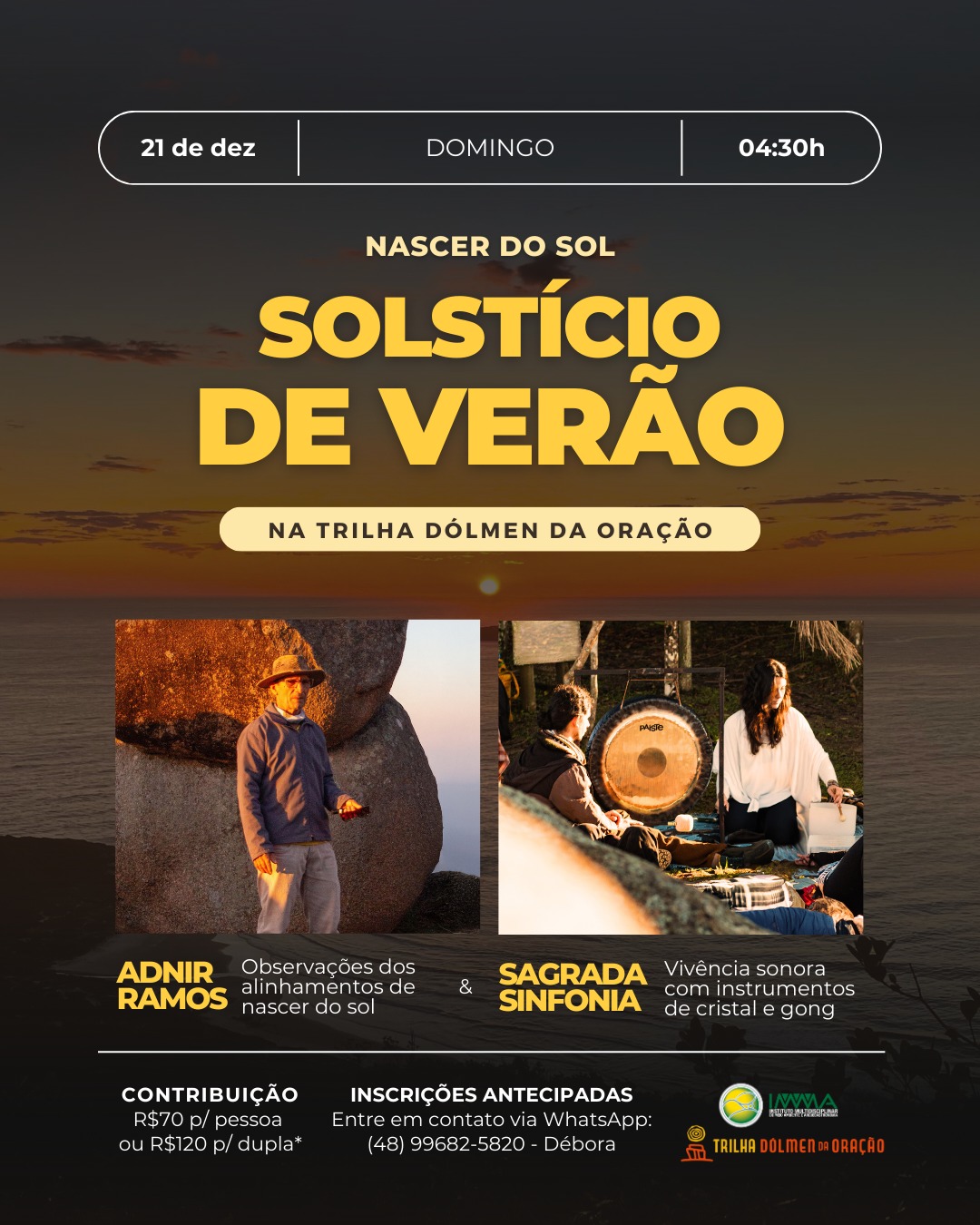 No entardecer do próximo sábado, dia 20 de dezembro, a Trilha Dólmen da Oração será novamente o ponto de encontro para mais uma caminhada arqueoastronômica, desta vez celebrando o Solstício de Verão. A atividade será conduzida pelo pesquisador Adnir Ramos, com observação dos alinhamentos do pôr do sol que marcam esse momento.